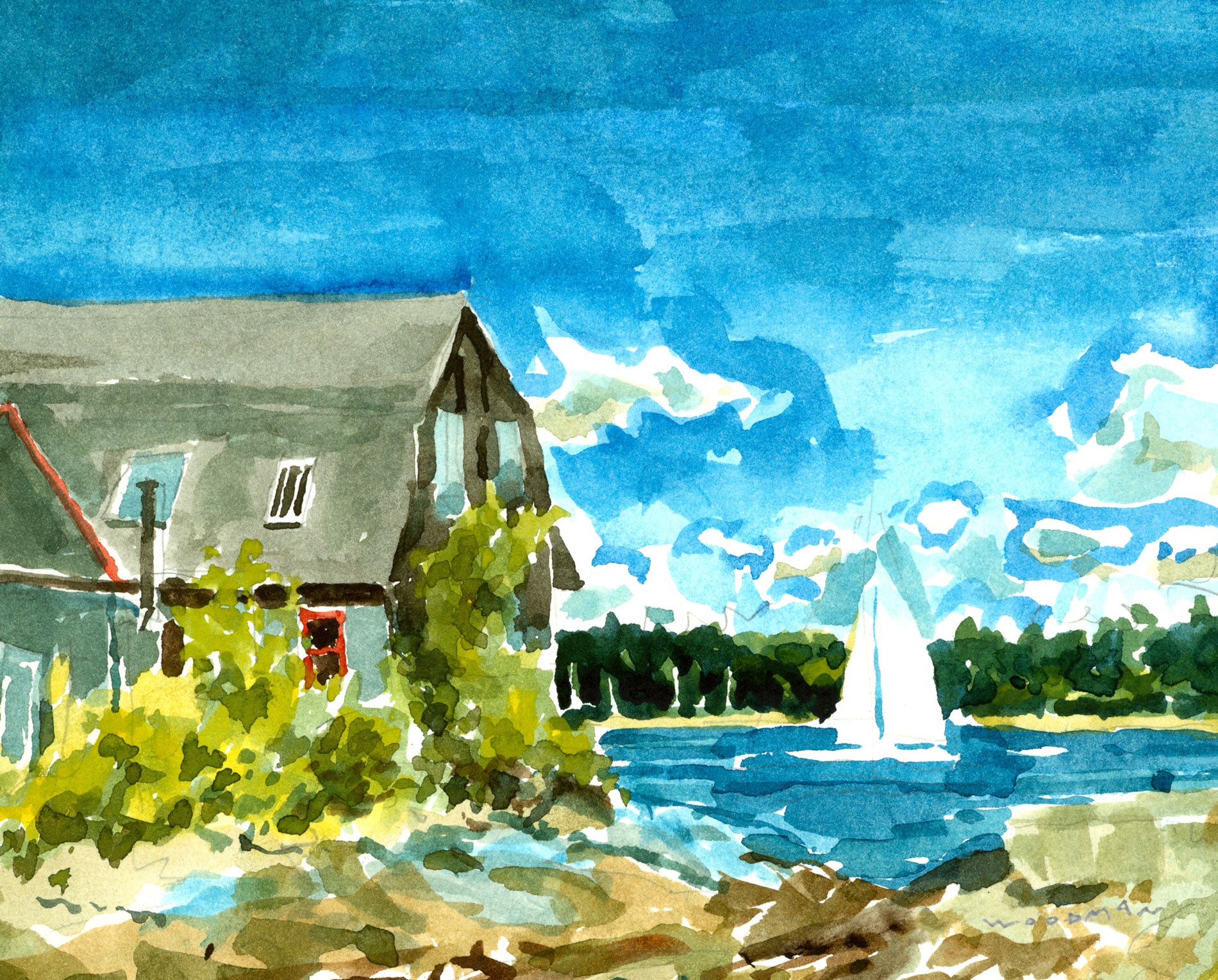 Plein-air watercolor of the Boat Yard in Brooklin, ME.