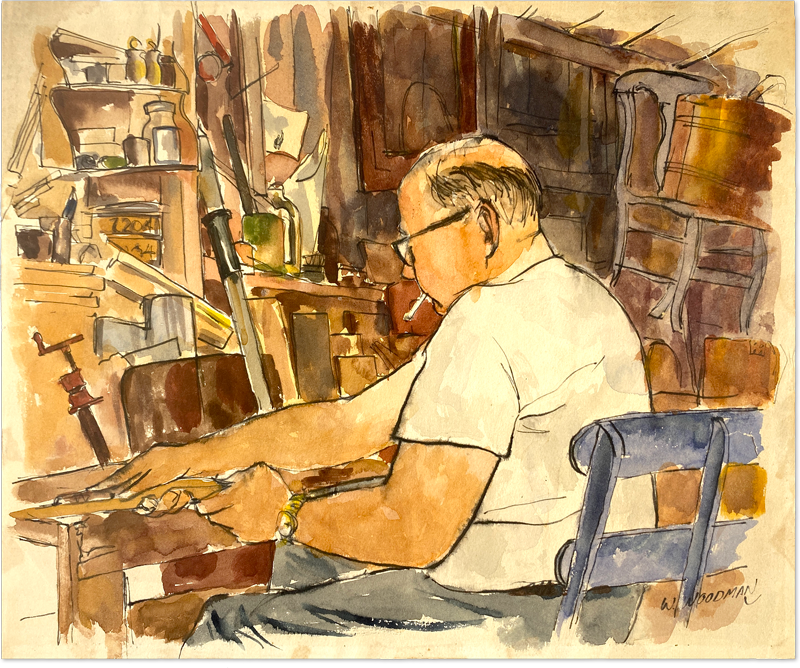 Plein-air Pen & Ink and Watercolor of Bill's father, Fred in his workshop where he restored antique furniture for a living in Maine
