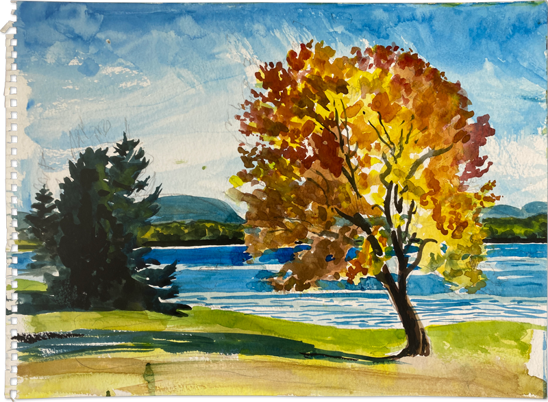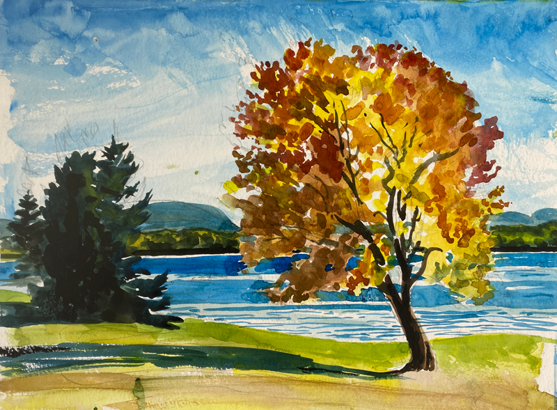 Plein-air watercolor of an autumn Maple casting a shadow in front of a waterfront with mountains (likely Acadia National Park) in the background. A clear crisp fall day in Maine.