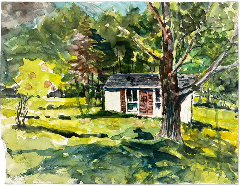 Plein-air watercolor of a small house in the woods of Maine. Black Lab in the yard under a shady tree.
