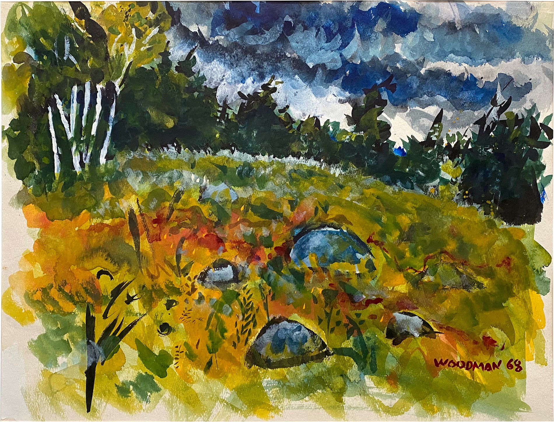Plein-air watercolor of a Maine Field sprinkled with boulders.