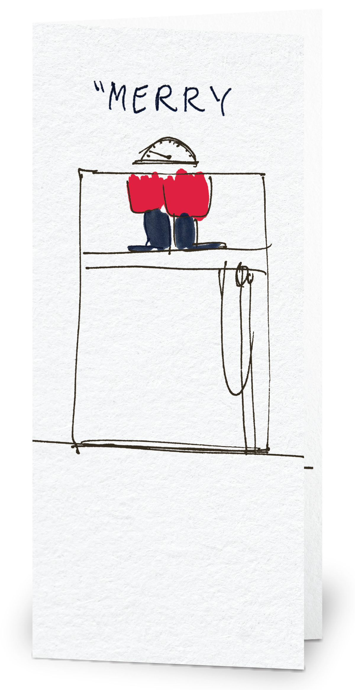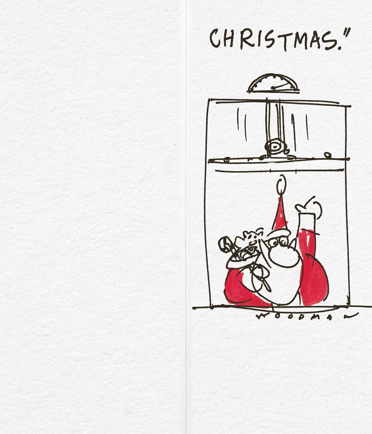 Hand-made Holiday Greeting card featuring Santa taking the elevator.