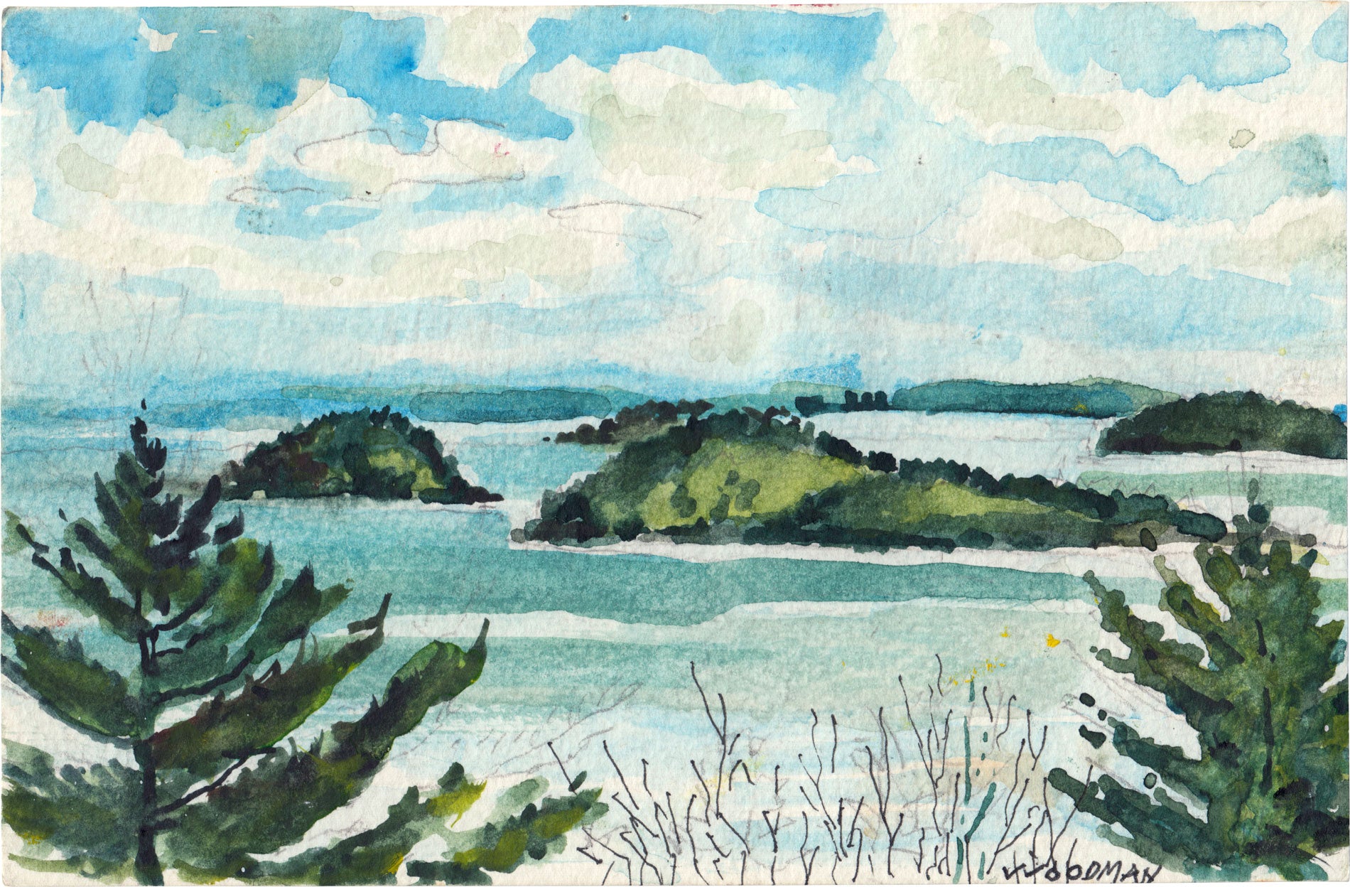 Plein-air watercolor of Islands off Mount Desert Island, Down East Maine.