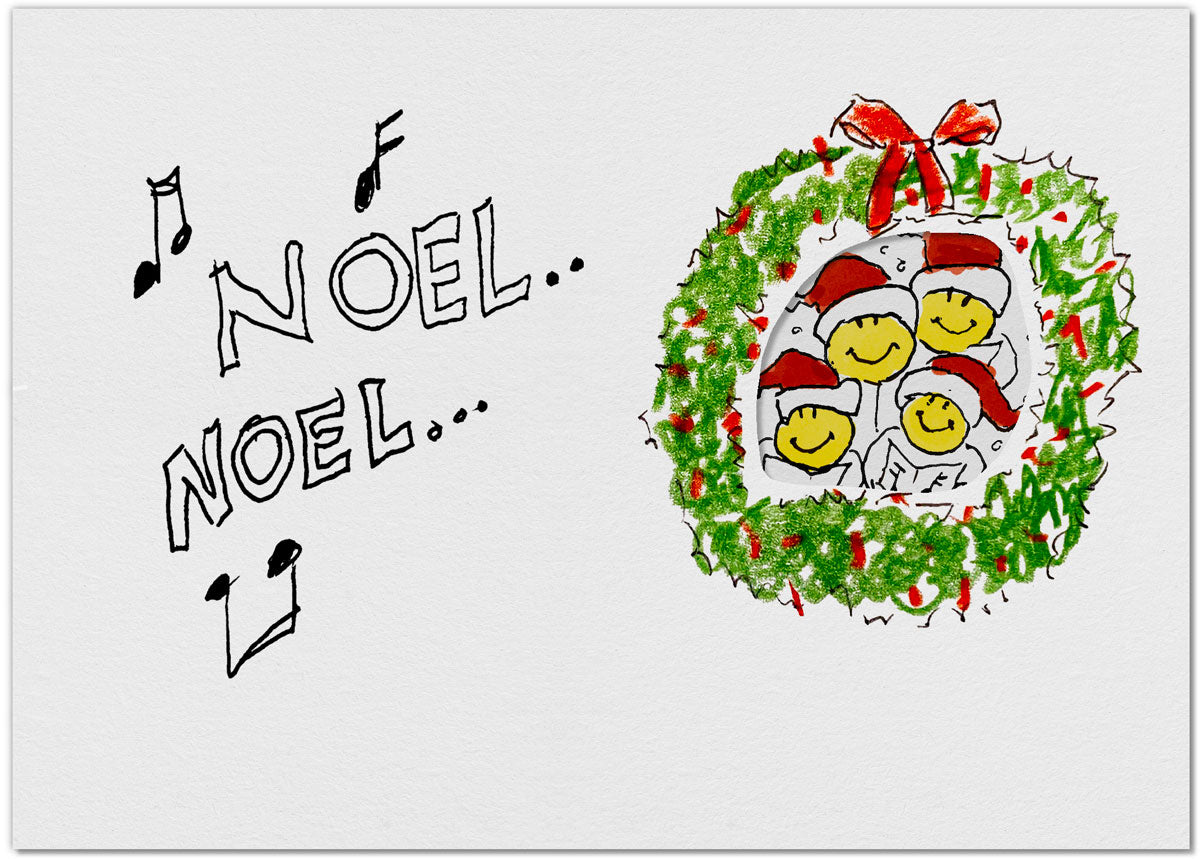 Hand-made, die-cut, Holiday Greeting card featuring a smily-face choir.