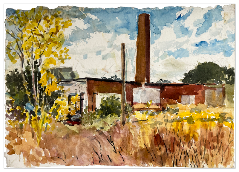 Plein-air watercolor of an abandoned factory, likely the old paper mill in Bucksport Maine. Beautiful mix of deep red hues in the old brick building surrounded by fall foliage, dry brush and a cloud scattered blue sky.